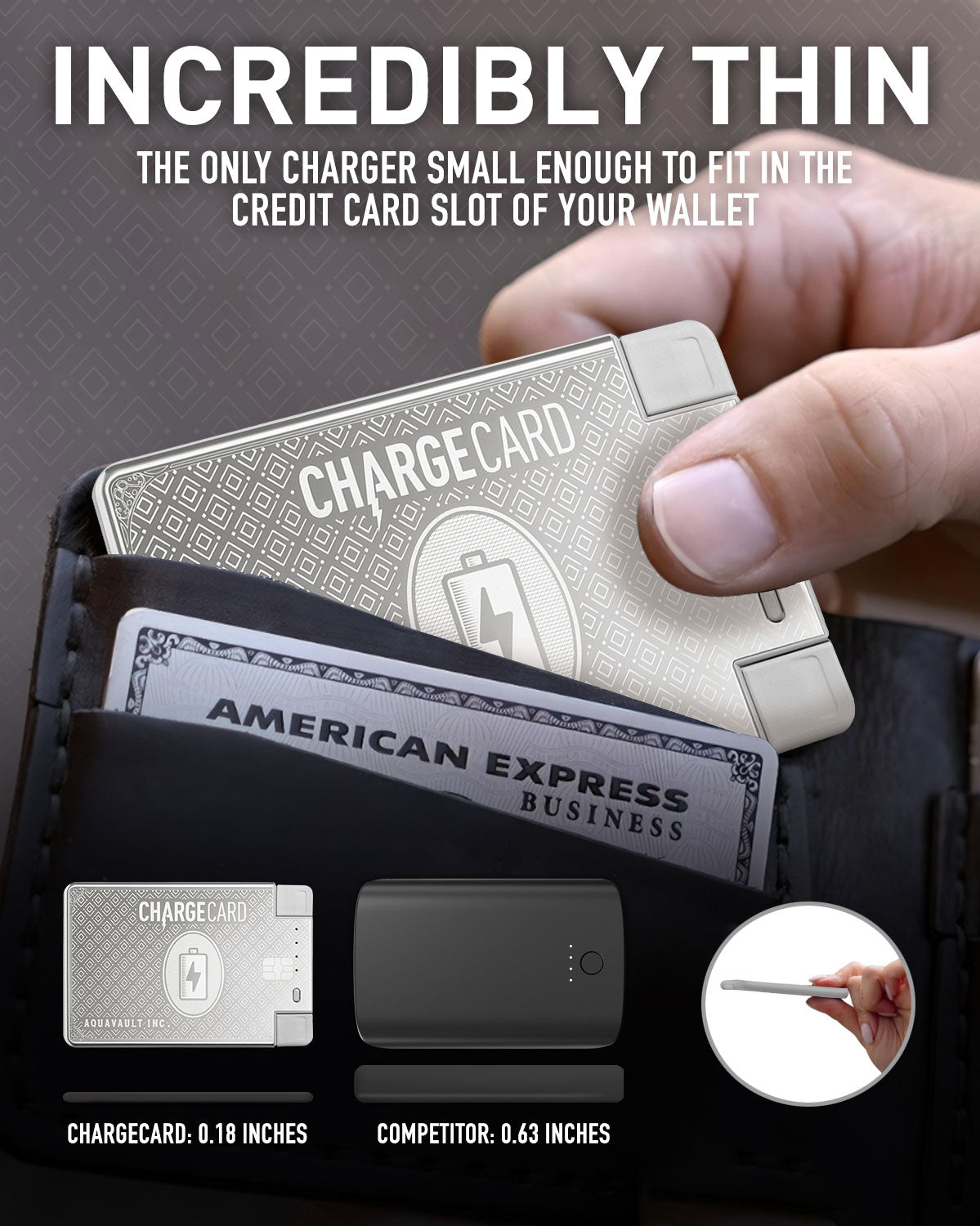 • The ChargeCard is a Credit-Card-Size Portable Charger that actually fits in your wallet (Most likely the smallest charger you have ever seen)