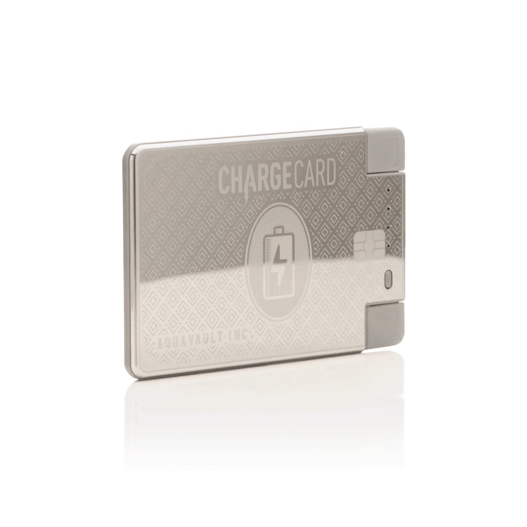 • Has four LED power lights which display how much battery is remaining. When the ChargeCard is dead, just charge it back up by plugging it into the wall or computer
